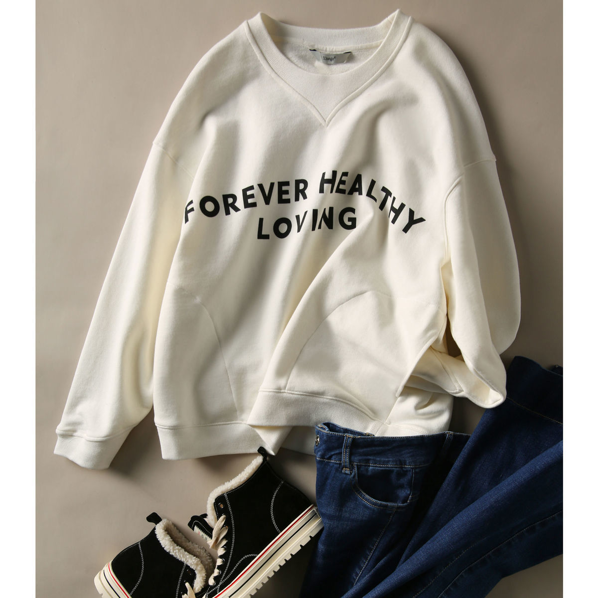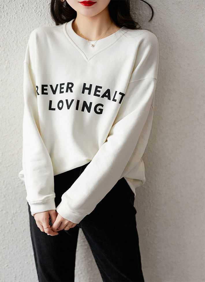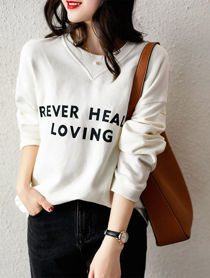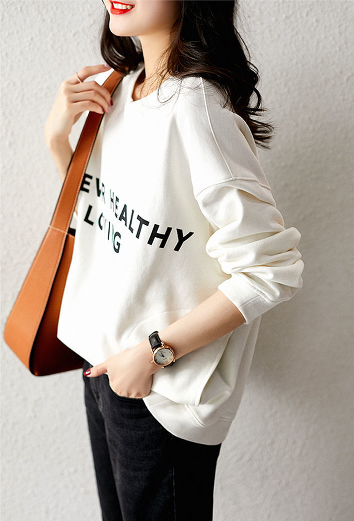 口袋卫衣女春秋圆领韩版简约白色纯棉宽松显瘦印花字母套头上衣女