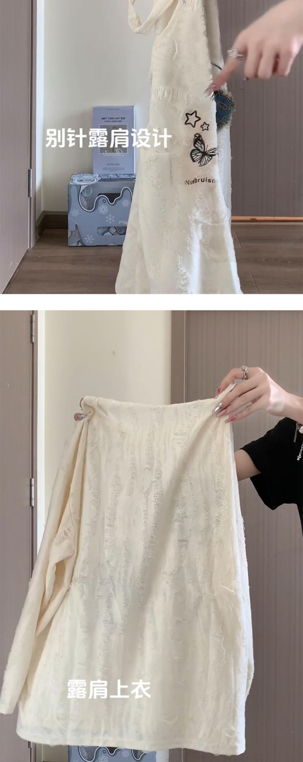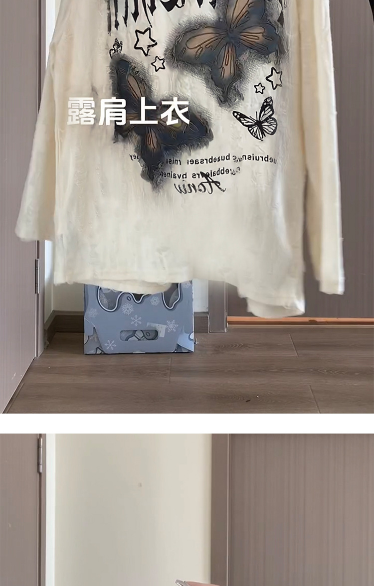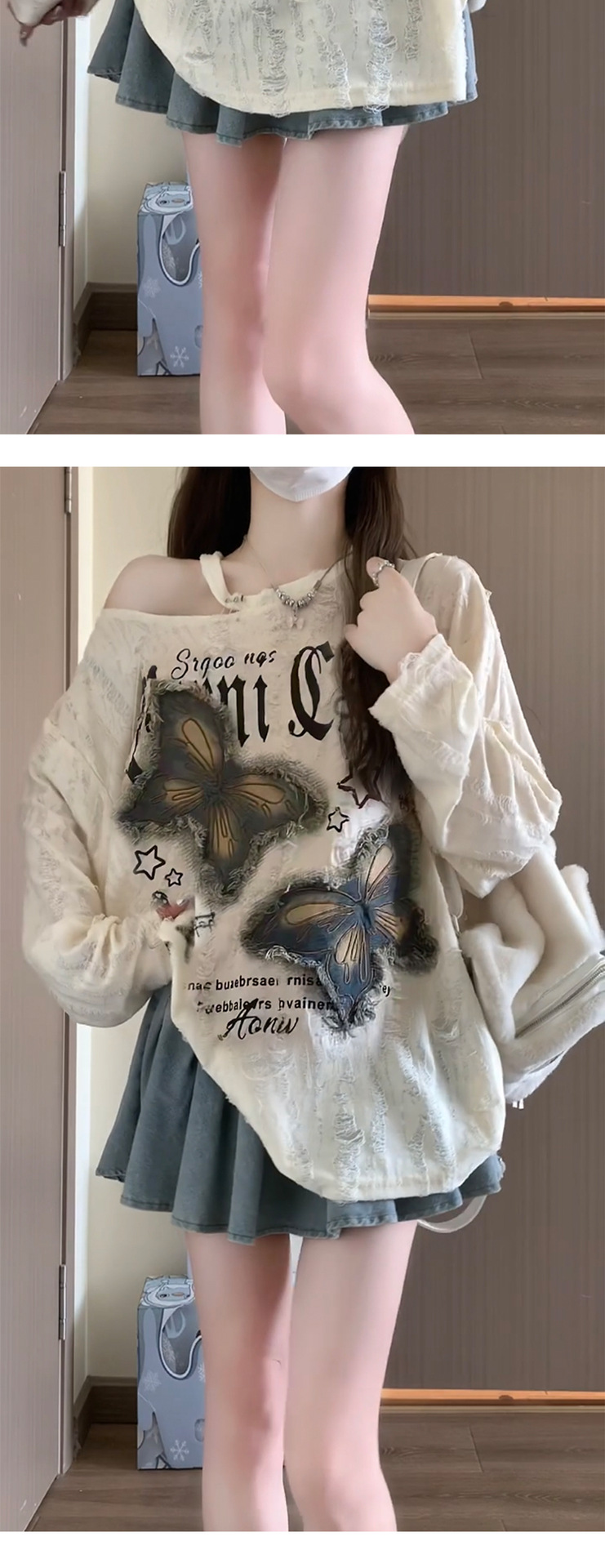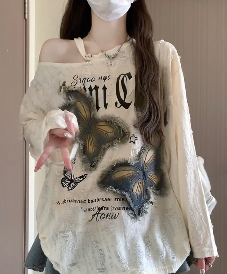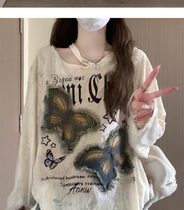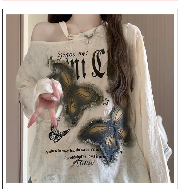原版破洞布 刺绣蝴蝶长袖T恤女春秋宽松慵懒破洞复古露肩上衣