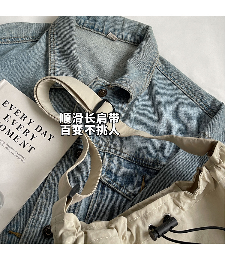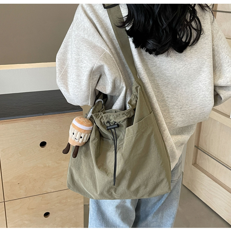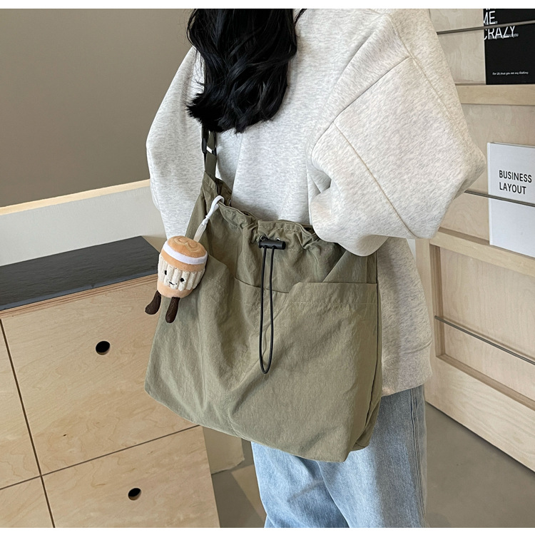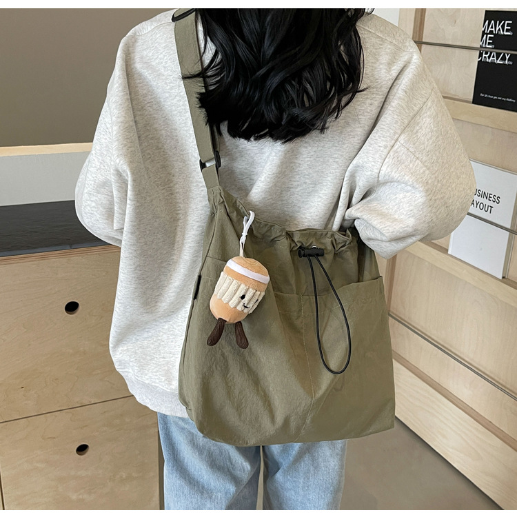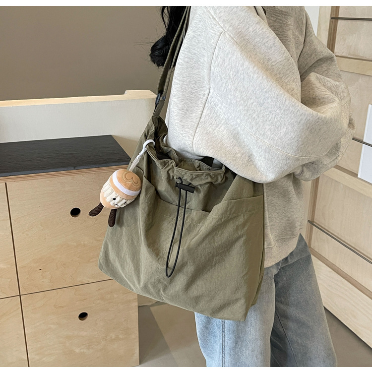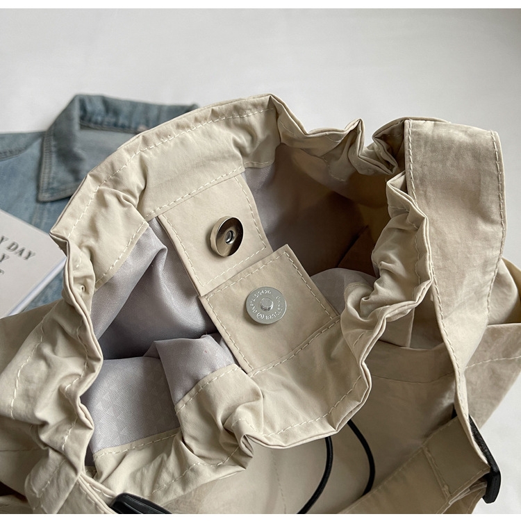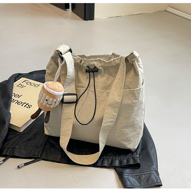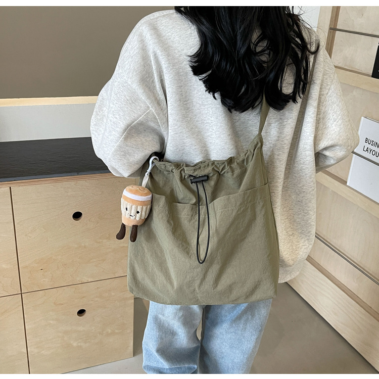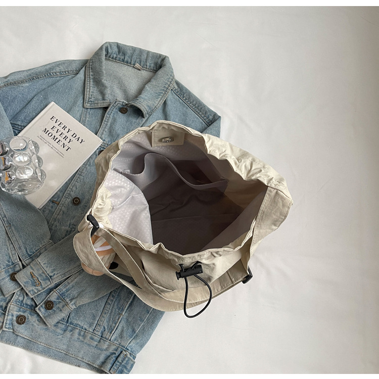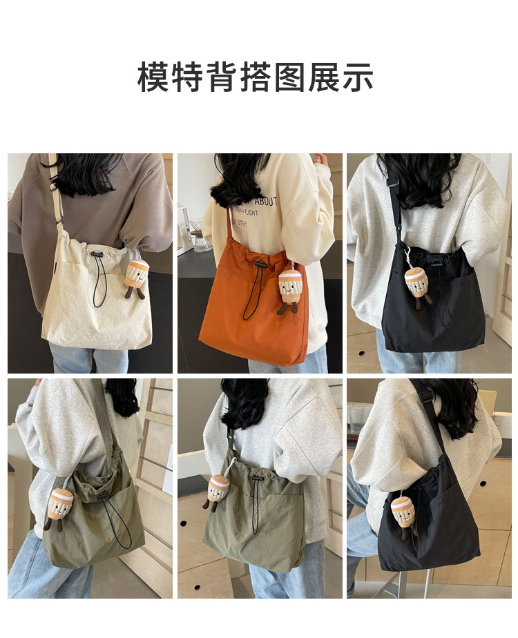 新款小众休闲文艺帆布水桶包时尚抽绳单肩女包网红褶皱尼龙斜挎包