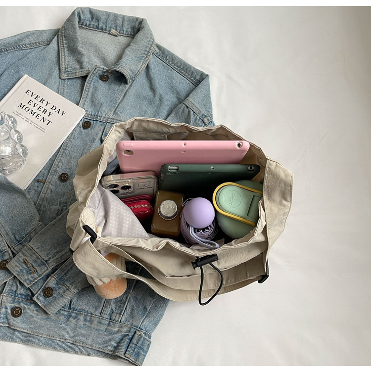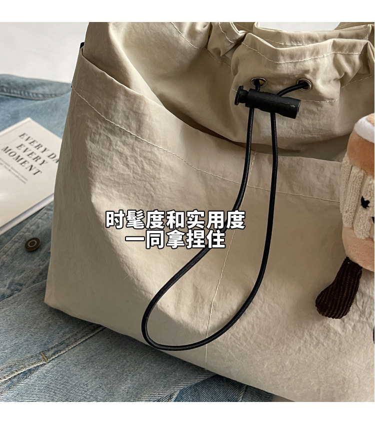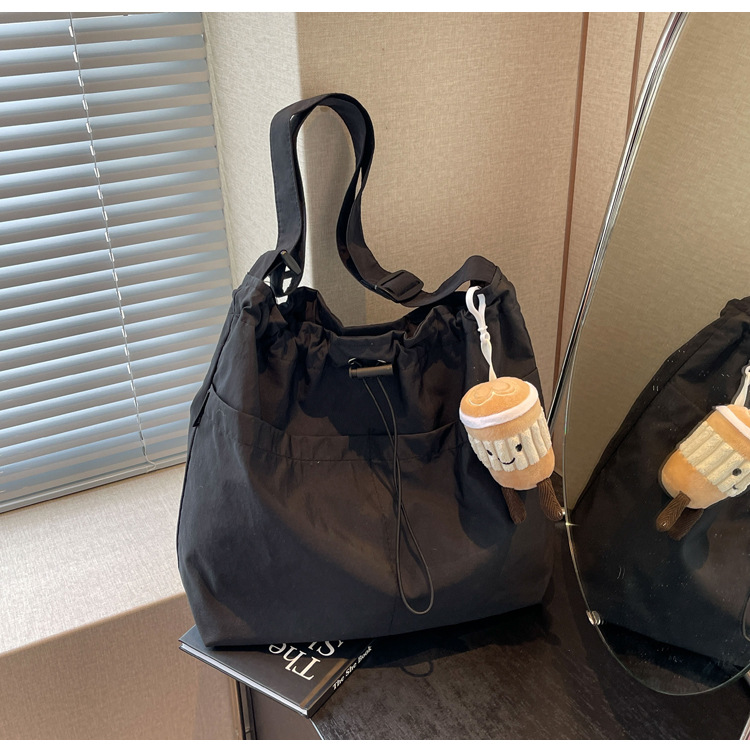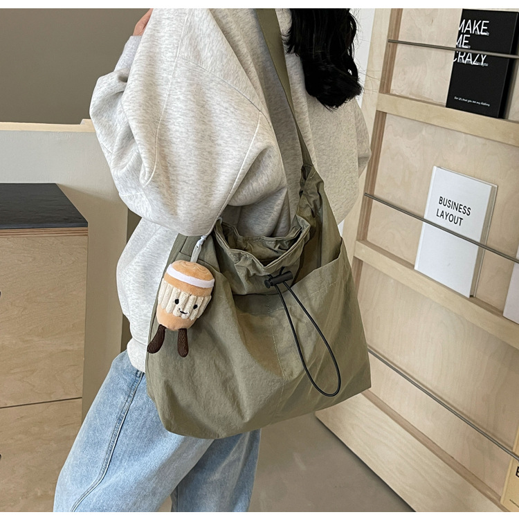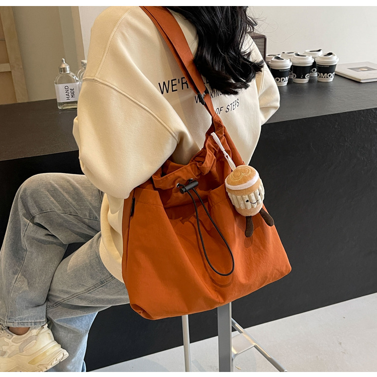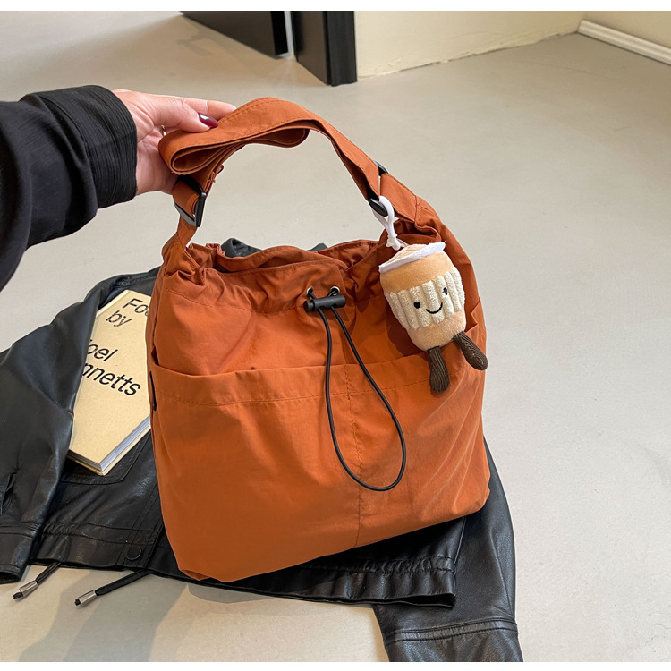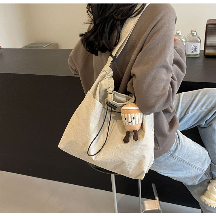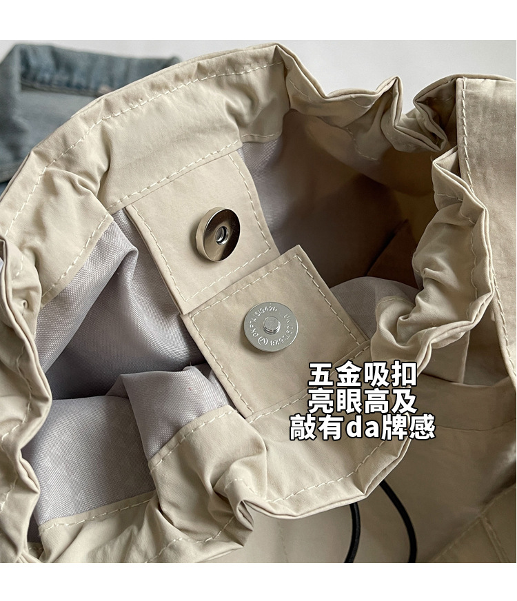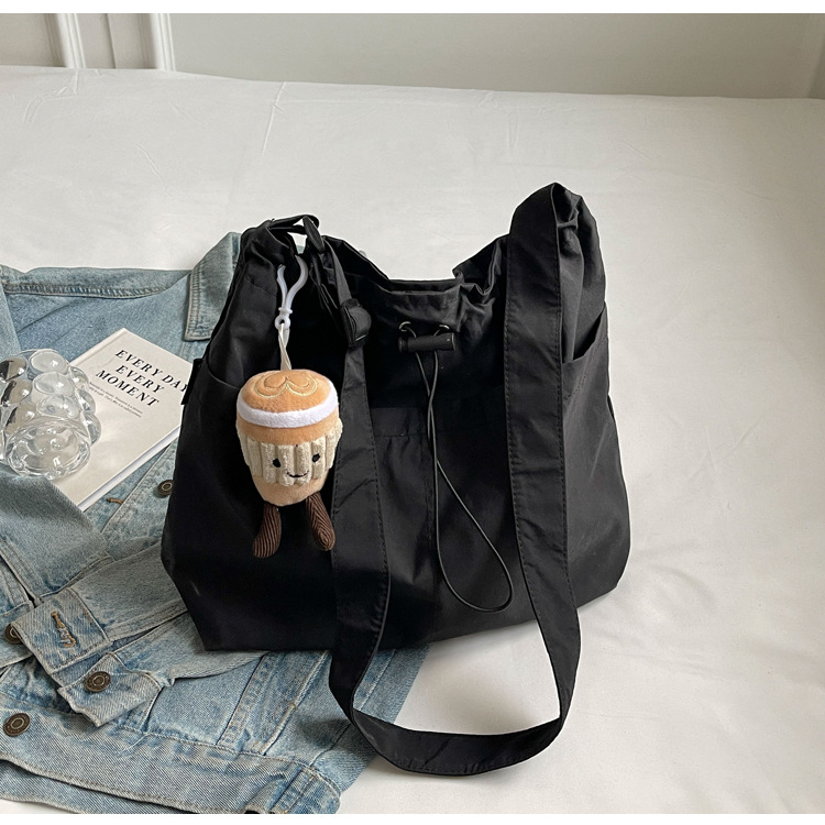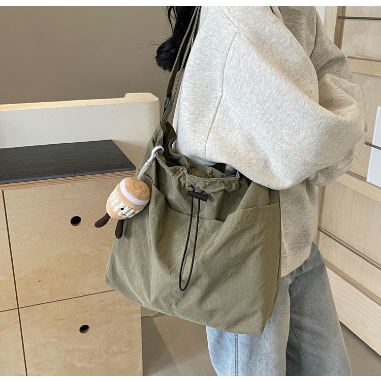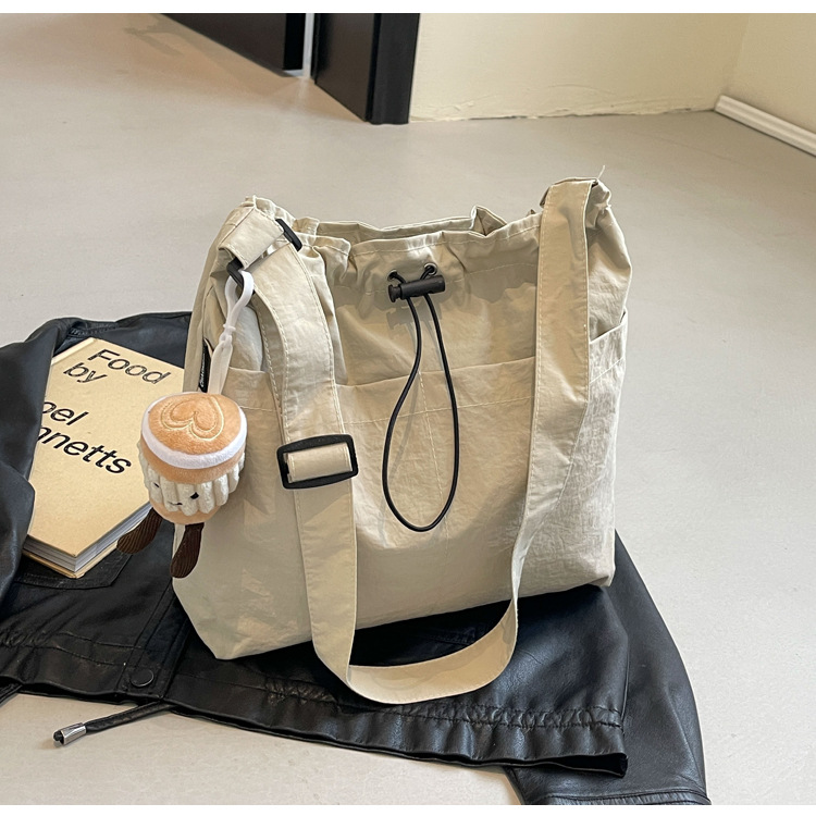 新款小众休闲文艺帆布水桶包时尚抽绳单肩女包网红褶皱尼龙斜挎包