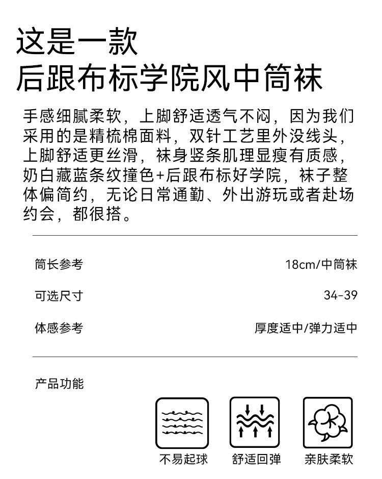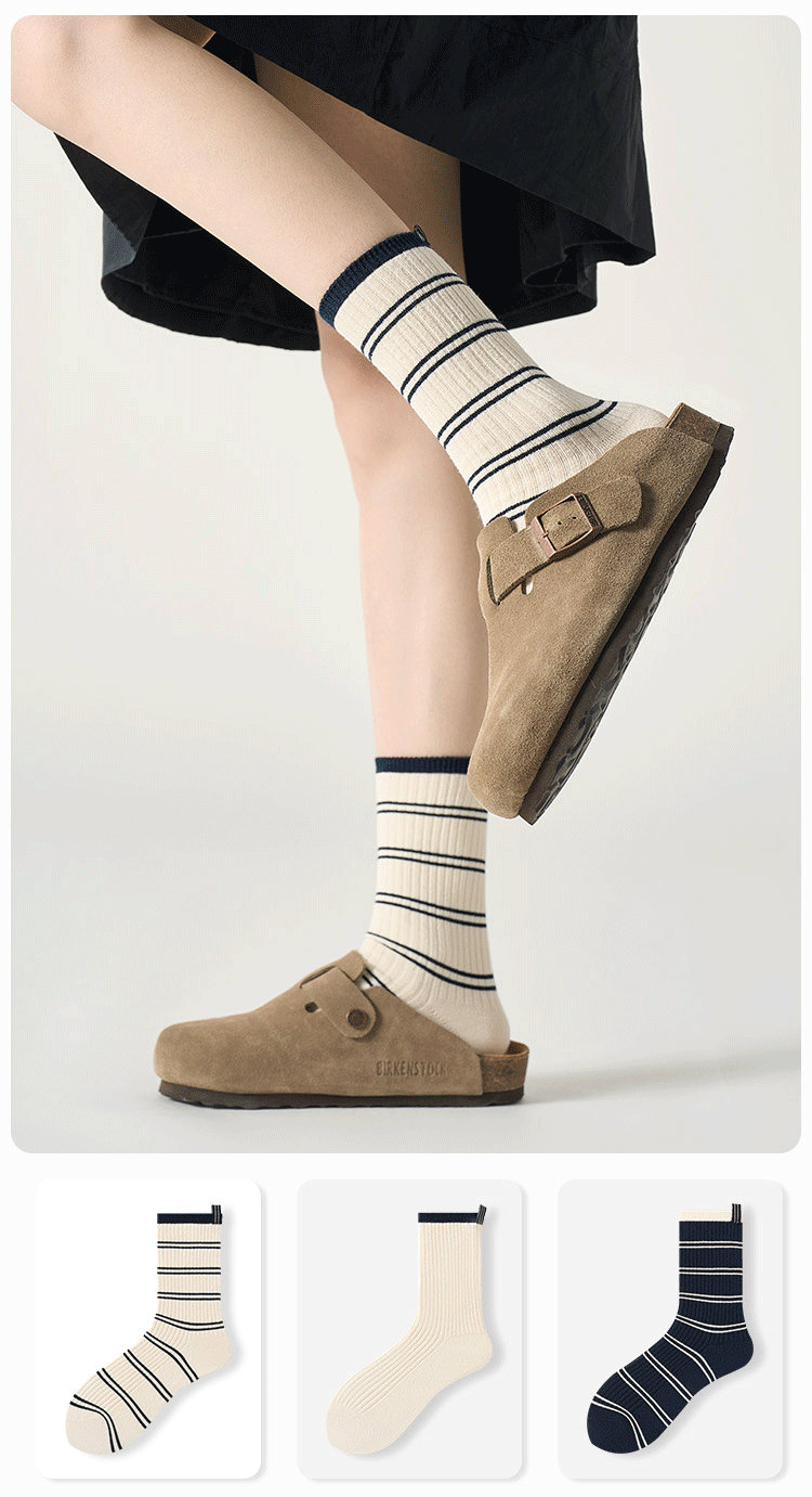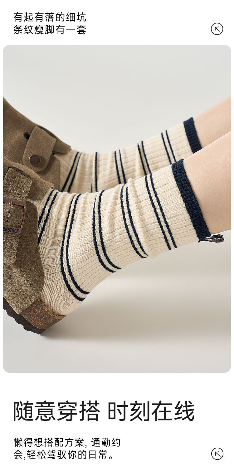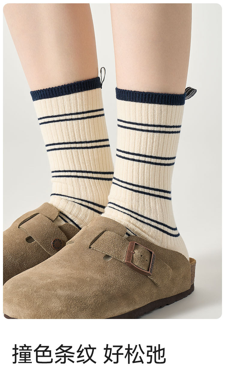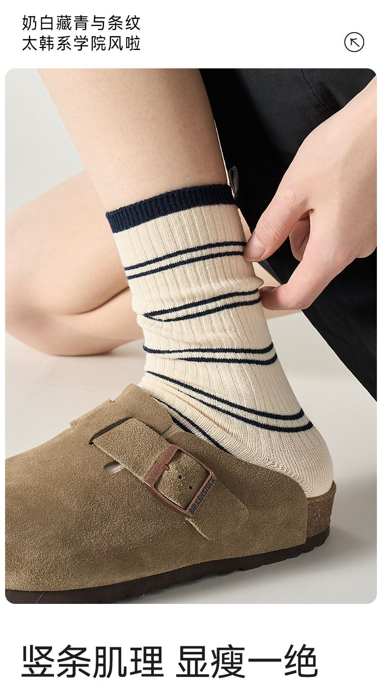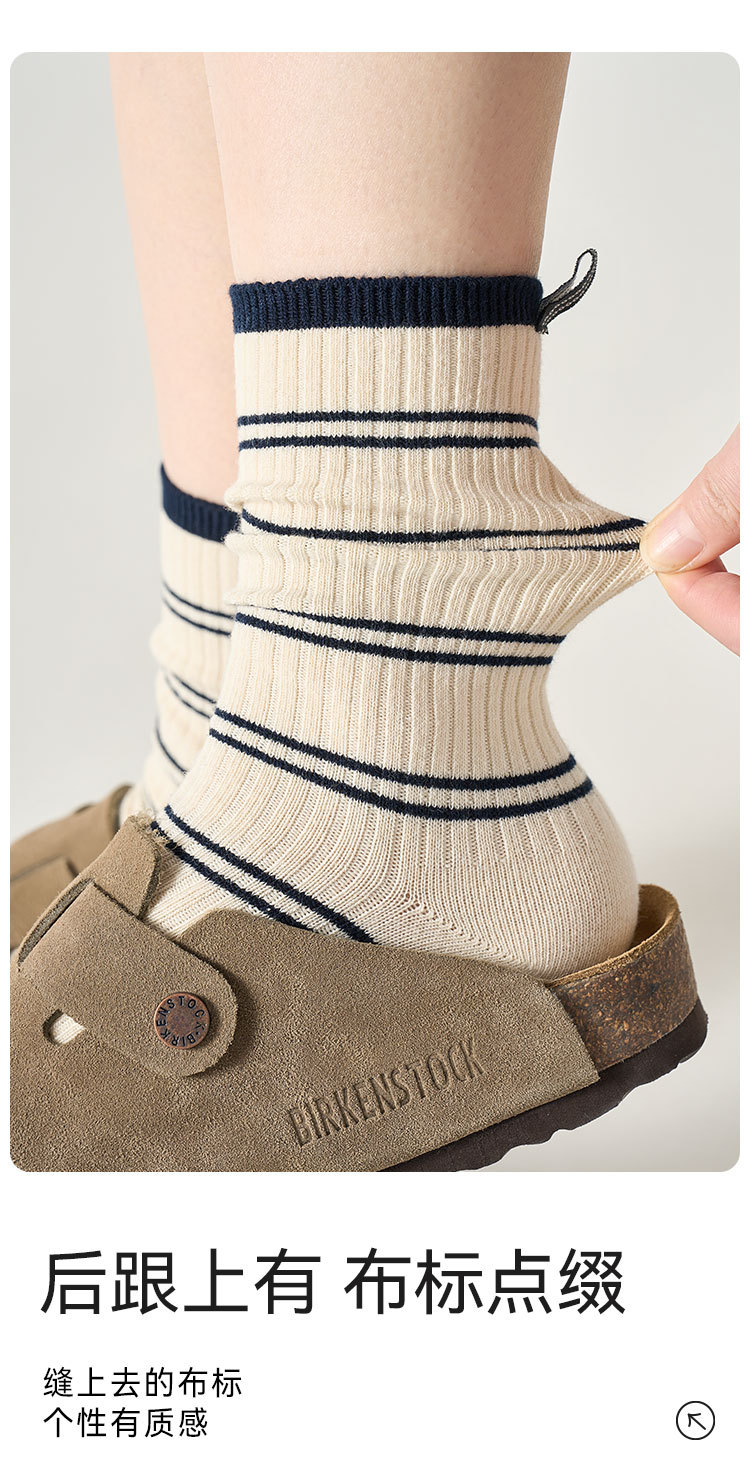 条纹袜子女春秋纯棉中筒袜ins潮韩版布标长袜配勃肯鞋堆堆袜秋冬